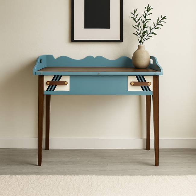 Ses pieds et rebords ont été poncés et teintés dans un brun chaud, tandis que la façade se parent d’un bleu vert doux relevé de motifs graphiques noir & blanc.