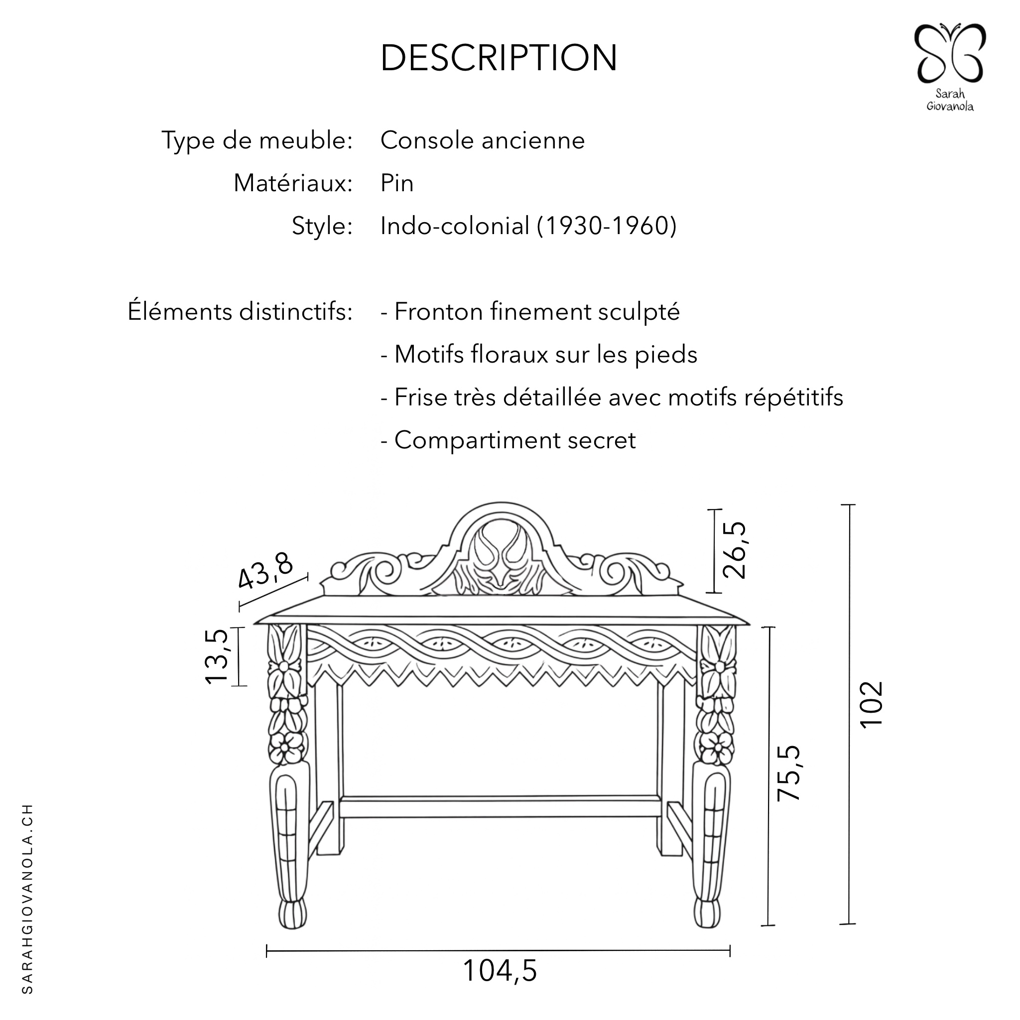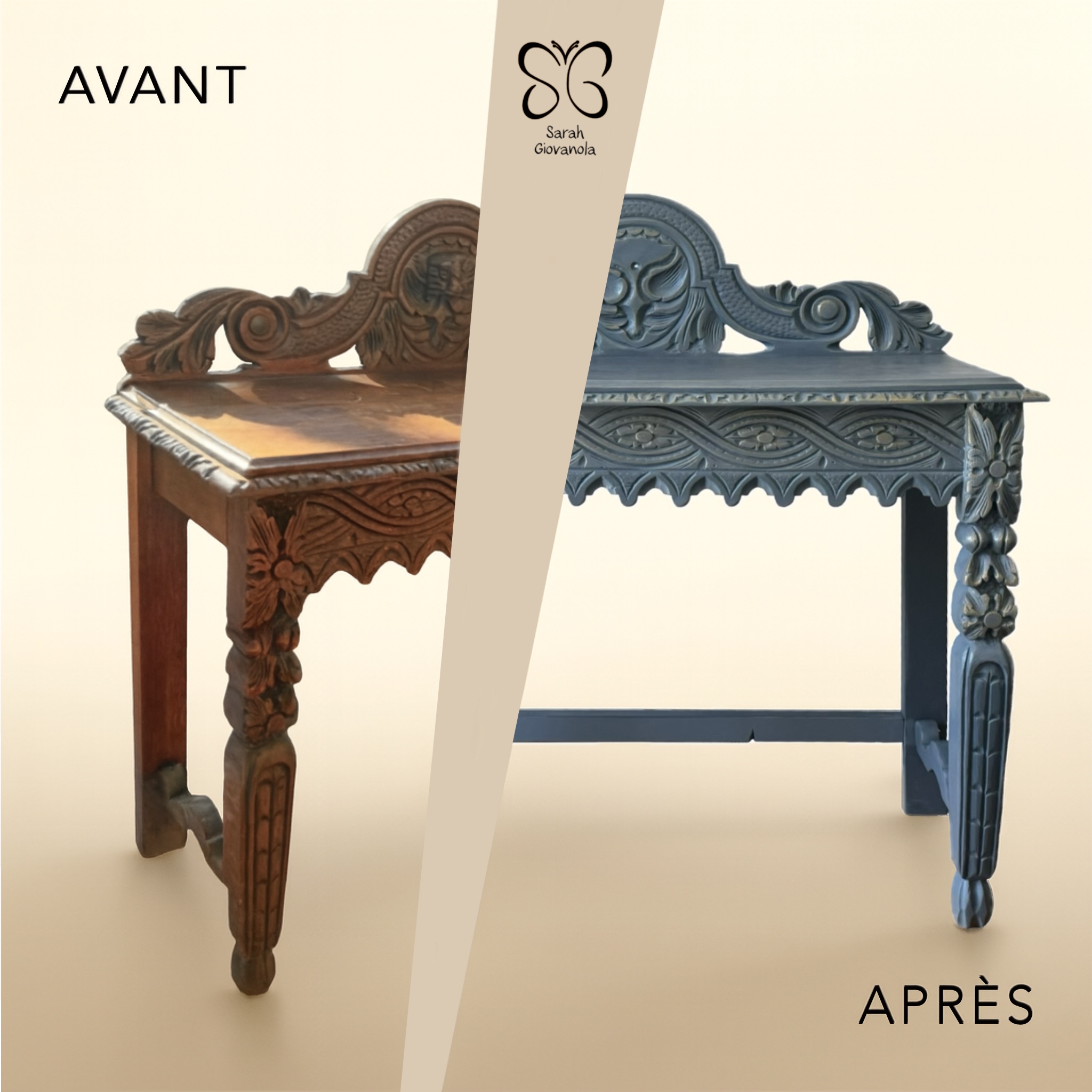 Console ancienne en bois massif finement sculpté, entièrement relookée à la main dans un élégant bleu-gris patiné d’or.
