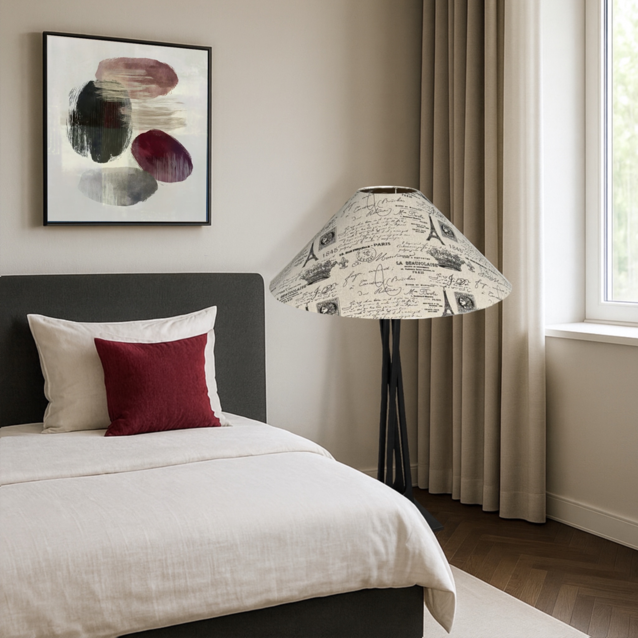 Grande lampe à poser élégante : pied en bois revisité en noir profond et abat-jour conique habillé d’un tissu imprimé “Paris vintage” en noir & écru (Tour Eiffel, calligraphies et cachets anciens).