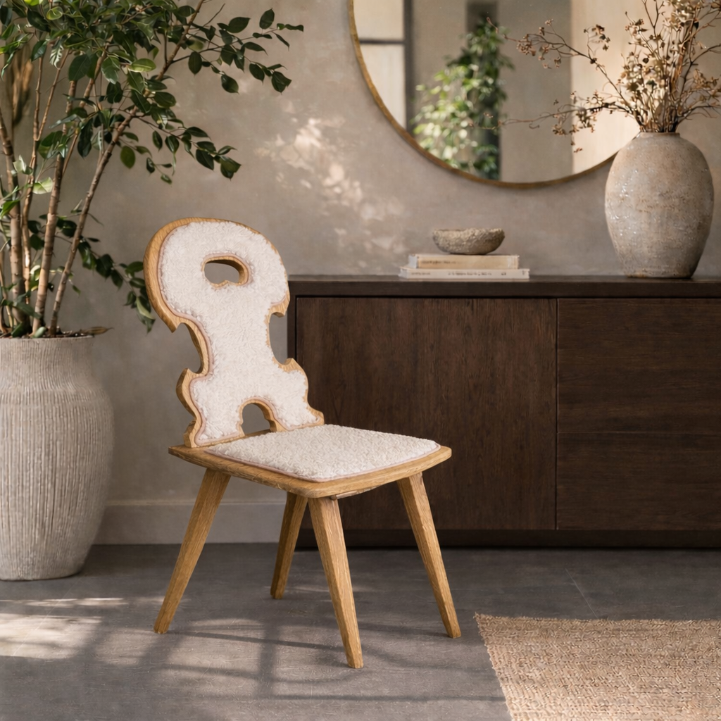 Son dossier sculpté, typique des fermes suisses et tyroliennes, dialogue ici avec une assise et un dossier habillés d’une laine bouclée douce et chaleureuse.